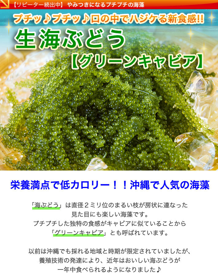 TOP沖縄の食品・調味料 海ぶどう 養殖場朝摘み:沖縄県産 生海ぶどう100g【常温発送】 価格: ¥1,296 (税込) [ポイント還元 12ポイント~] 販売期間: 数量: パック 在庫: 在庫あり 在庫 在庫あり 返品についての詳細はこちら